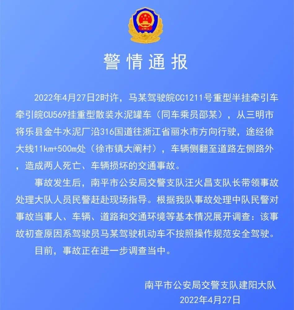 4月27日,福建省南平市公安局交警支隊(duì)建陽(yáng)大隊(duì)發(fā)布一則警情通報(bào)稱,2022年4月27日2時(shí)許,馬某駕駛皖CC1211號(hào)重型半掛牽引車牽引皖CU569掛重型散裝水泥罐車(同車乘員邵某),從三明市將樂縣金牛水泥廠沿316國(guó)道往浙江省麗水市方向行駛,途經(jīng)徐大線11km+500m處(徐市鎮(zhèn)大闡村), 車輛側(cè)翻至道路左側(cè)路外造成兩人死亡、車輛損壞的交通事故。