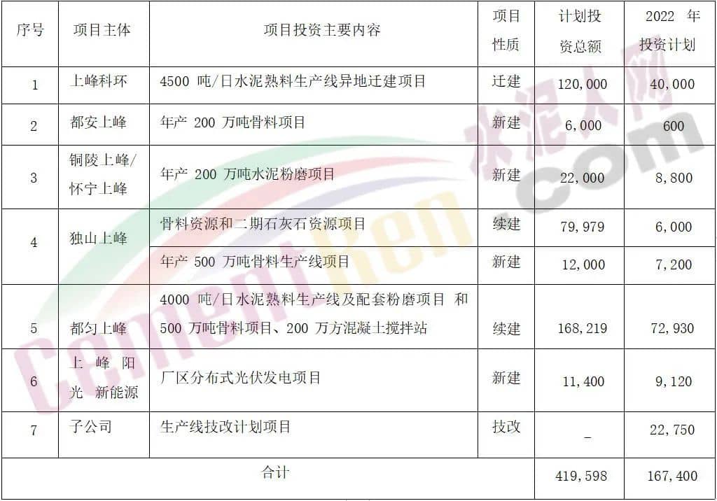 4月26日晚間,甘肅上峰水泥股份有限公司發(fā)布《關(guān)于公司2022年度項(xiàng)目投資計(jì)劃的公告》稱,根據(jù)公司中期戰(zhàn)略發(fā)展規(guī)劃,結(jié)合公司經(jīng)營實(shí)際及 2022 年投資重點(diǎn)工作,公司控股子公司浙江上峰科環(huán)建材有限公司、都安上峰水泥有限公司、銅陵上峰水泥股份有限公司、懷寧上峰水泥有限公司、貴州獨(dú)山上峰水泥有限公司、都勻上峰西南水泥有限公司、寧夏上峰萌生建材有限公司和浙江上峰陽光新能源有限公司等將通過一系列的新建、技術(shù)改造、 擴(kuò)建等投資方式來逐步落實(shí)公司主業(yè)規(guī)模的持續(xù)擴(kuò)張,上述投資項(xiàng)目計(jì)劃將主要圍繞公司主業(yè)經(jīng)營發(fā)展,以此進(jìn)一步增加公司盈利能力,提升公司綜合實(shí)力。經(jīng)預(yù)測,上述項(xiàng)目總投資額為人民幣419,598萬元,其中2022年度計(jì)劃投資金額為167,400 萬元。