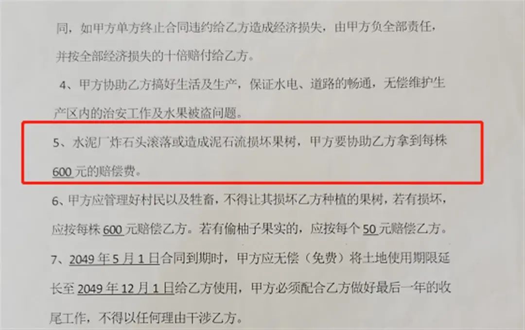 楊先生與曼空村簽訂的土地租賃合同書顯示,楊先生租用的170余畝土地位于華新紅塔水泥廠采石山腳下,其中提到:“水泥廠炸石頭滾落或造成泥石流損壞果樹,出租方需要協(xié)助楊先生拿到每株600元的賠償費。”