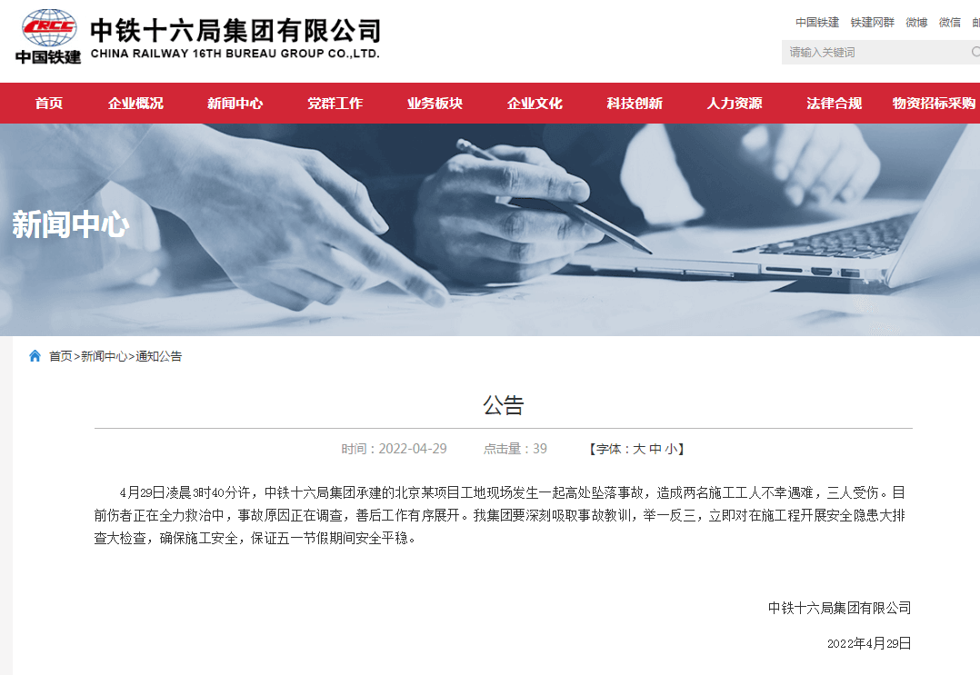 目前傷者正在全力救治中,事故原因正在調(diào)查,善后工作有序展開。中鐵十六局集團(tuán)要深刻吸取事故教訓(xùn),舉一反三,立即對(duì)在施工程開展安全隱患大排查大檢查,確保施工安全,保證五一節(jié)假期間安全平穩(wěn)。