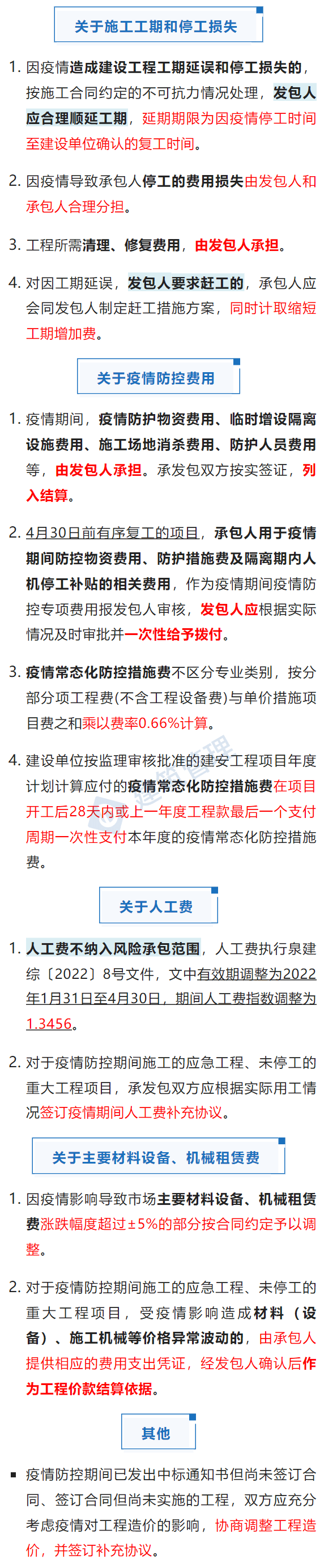 1.人工費(fèi)不納入風(fēng)險(xiǎn)承包范圍,人工費(fèi)執(zhí)行《泉州市住房和城鄉(xiāng)建設(shè)局關(guān)于調(diào)整春節(jié)期間及節(jié)后建設(shè)工程人工費(fèi)指數(shù)的通知》(泉建綜〔2022〕8號(hào)),文中有效期調(diào)整為2022年1月31日至4月30日,期間人工費(fèi)指數(shù)調(diào)整為1.3456。工程參建各方要做好人工費(fèi)指數(shù)調(diào)整期間完成工程量的確認(rèn)工作。