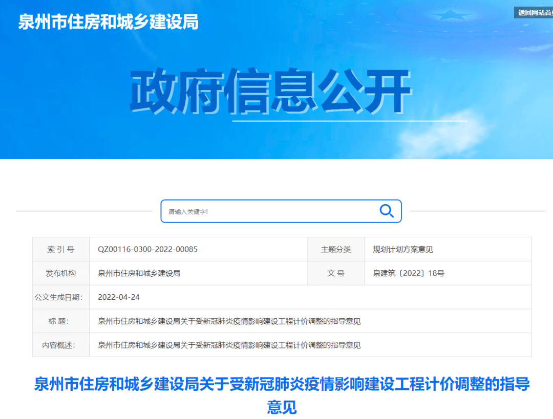 4月24日,泉州市住建局發(fā)布了《關(guān)于受新冠肺炎疫情影響建設(shè)工程計(jì)價(jià)調(diào)整的指導(dǎo)意見(jiàn)》。