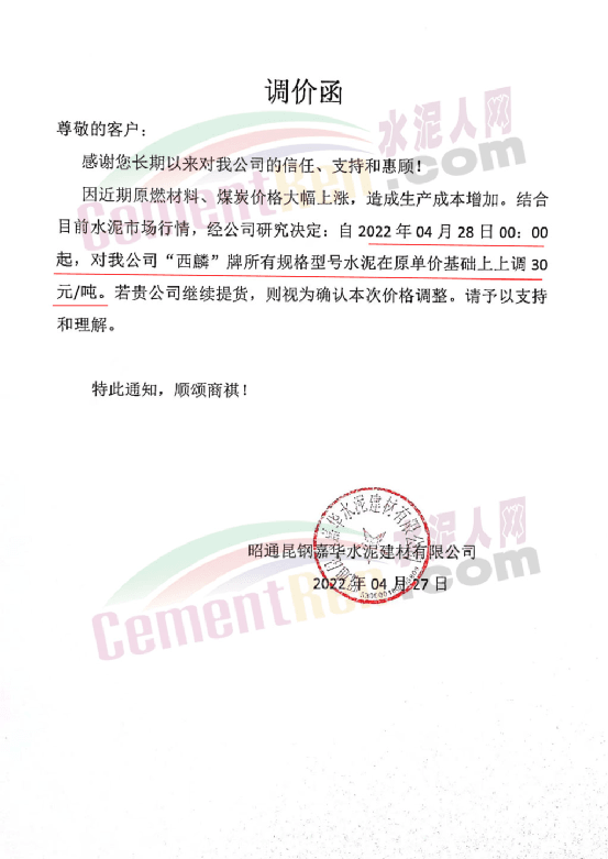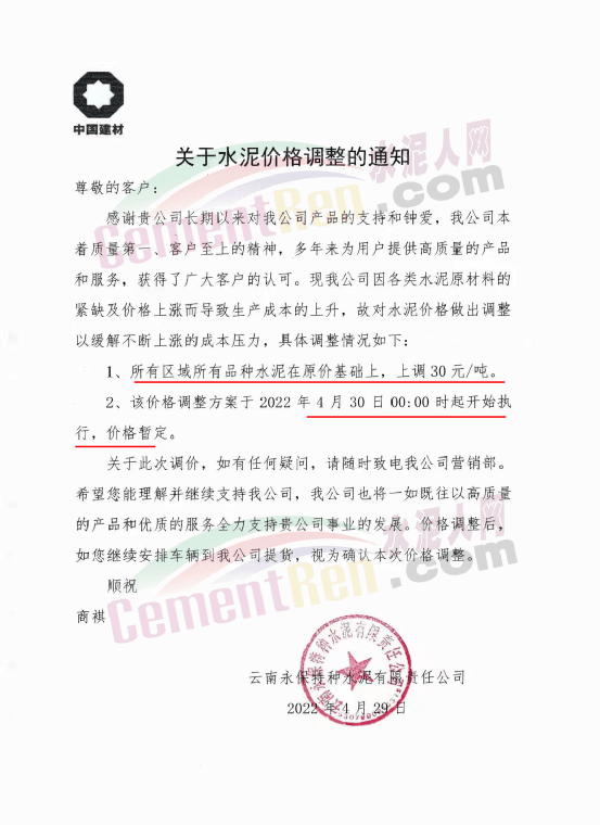 云南永保特種水泥有限責(zé)任公司通知,因各類水泥原材料的緊缺及價(jià)格上漲而導(dǎo)致生產(chǎn)成本的上升,故對水泥價(jià)格做出調(diào)整以緩解不斷上漲的成本壓力,自2022年4月30日0時(shí)起所有區(qū)域所有品種水泥在原價(jià)基礎(chǔ)上上調(diào) 30元/噸。