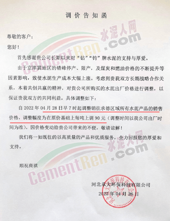 河北承大環(huán)??萍纪ㄖ捎诰┙蚣降貐^(qū)的錯(cuò)峰停產(chǎn)、限產(chǎn),及煤炭和燃油價(jià)格的不斷提升等因素影響,致使水泥生產(chǎn)成本大幅上漲。自4月28日早7時(shí)起調(diào)整銷往承德區(qū)域所有水泥產(chǎn)品的銷售價(jià)格,調(diào)整幅度為在原價(jià)基礎(chǔ)上每噸上調(diào)90元。