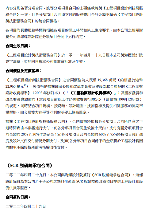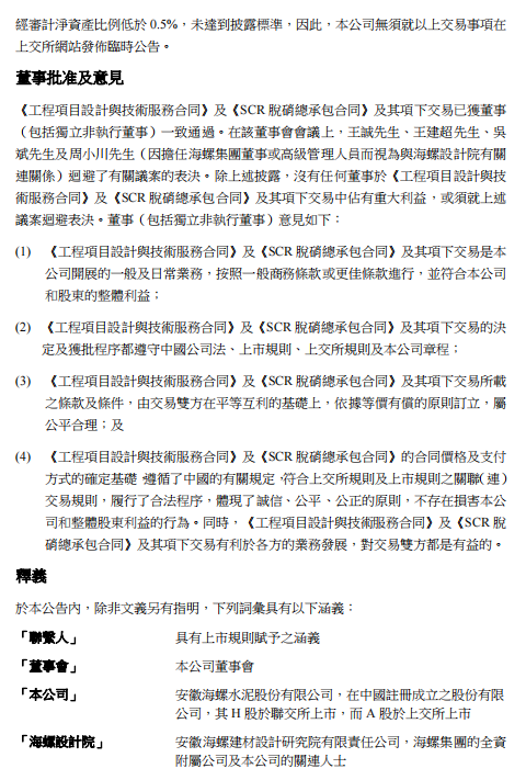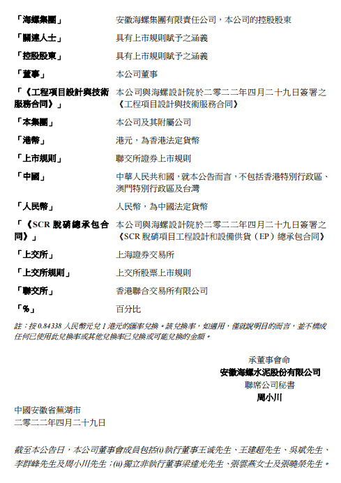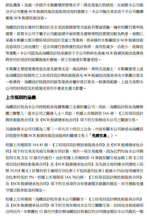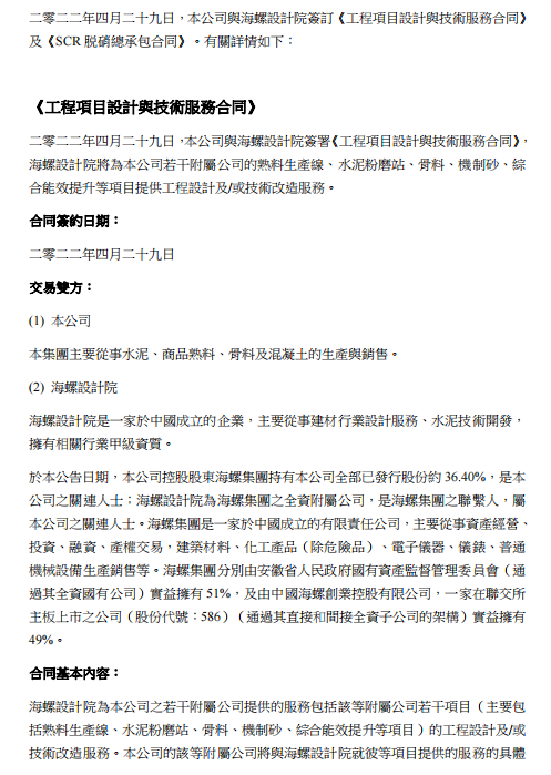 SCR脫硝技改服務,2022年4月29日,本公司與海螺設計院簽署《SCR脫硝總承包合同》,根據(jù)該合同,海螺設計院將為本公司若干子公司之熟料生產線提供SCR脫硝技術改造服務,注合同價格為人民幣12,750萬元(約相當于港幣15,118萬元)。