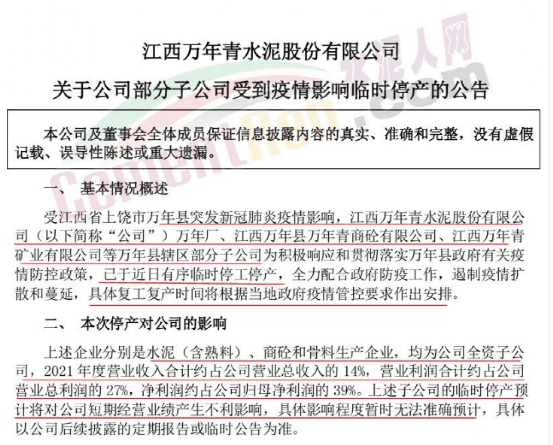 同期,上市公司萬年青發(fā)公告稱,受疫情影響,旗下多家子公司停工停產。停產所涉及的子公司占企業(yè)2021年度營業(yè)總收入的14%,營業(yè)利潤約占總營業(yè)潤的27%,凈利潤約占公司歸母凈利潤的39%。臨時停產將對公司短期經營業(yè)績產生不利影響,具體影響程度暫時無法準確預計。