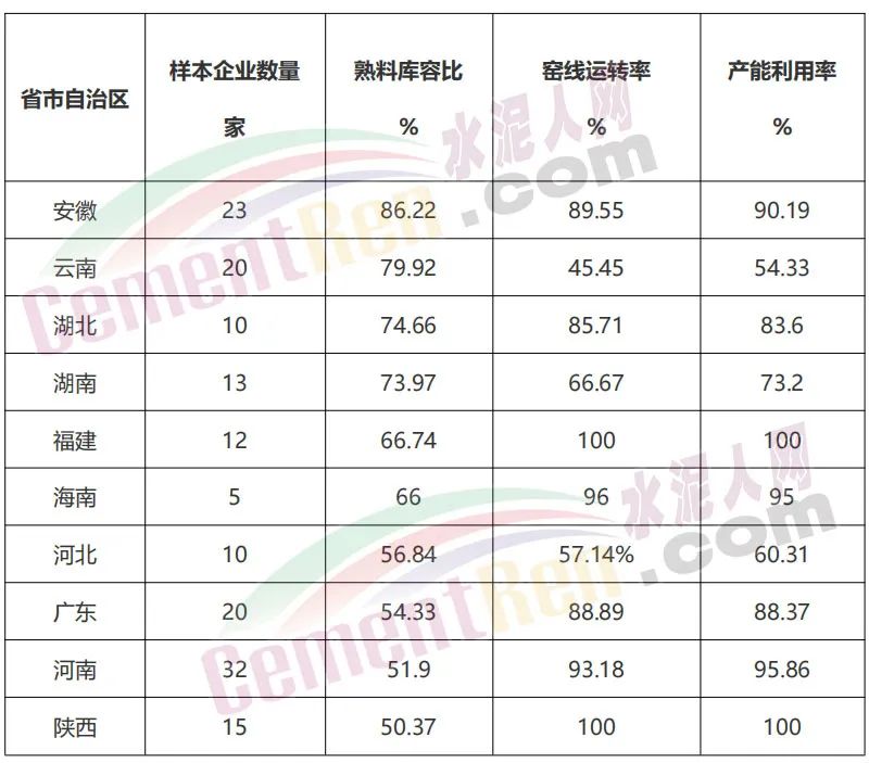 據水泥人網五月初調研數據顯示,安徽、云南、湖北、湖南、福建、海南、河北、廣東、河南、陜西等十余個省份,熟料庫容比均在50%以上,其中安徽、云南等省份達到了80%左右。產能利用率方面僅福建和陜西達到了100%。