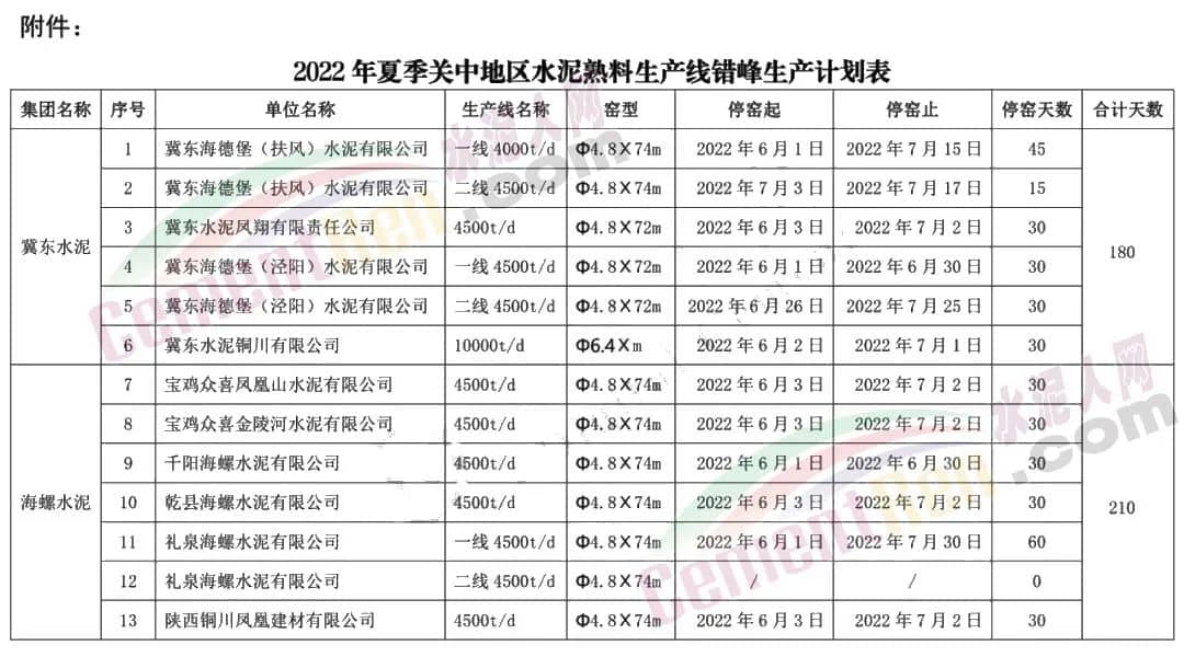 4月29日,陜西省水泥協(xié)會發(fā)布關于做好關中地區(qū)2022年夏季水泥熟料錯峰生產工作的通知,要求關中地區(qū)所有水泥熟料生產線于2022年6月1日至7月31日期間錯峰停窯30天/線。 水泥人網注意到,陜西關中海螺水泥、冀東水泥、堯柏水泥、聲威水泥、生態(tài)水泥、聲威特種、滿意水泥等7家水泥企業(yè),最長停窯210天,28條生產線合計共停窯864天;銅川兩條萬噸線分別于6月8日和6月2日開始停窯限產,堯柏水泥萬噸線將于6月8日至6月30日期間停產23天。冀東水泥萬噸線于6月2日至7月1日期間停產30天。