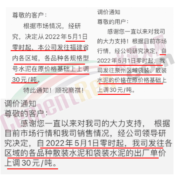 同期,福建區(qū)域多家企業(yè)通知福建省全區(qū)域“普漲30元/噸”,企業(yè)漲價(jià)通知函稱,由于燃煤、用電價(jià)格上漲,加之運(yùn)輸費(fèi)用漲幅明顯,水泥生產(chǎn)經(jīng)營成本增加,為轉(zhuǎn)移成本壓力,提升盈利,決定上調(diào)水泥價(jià)格。