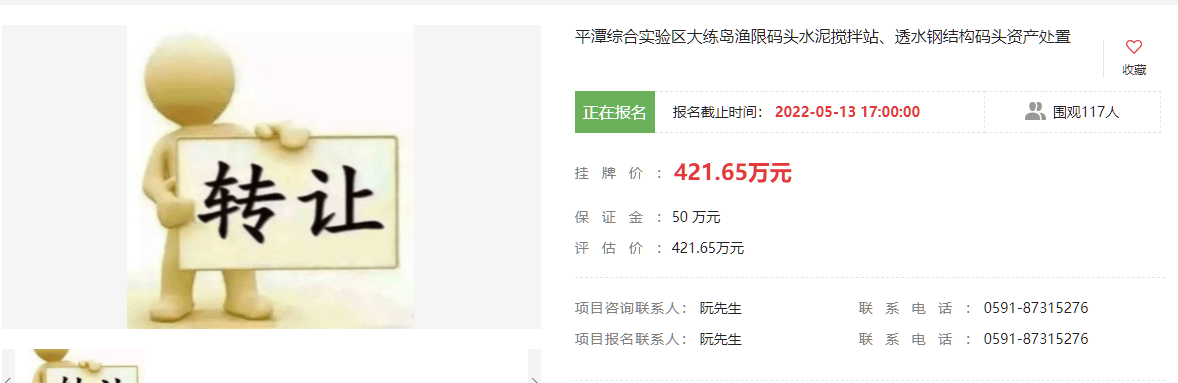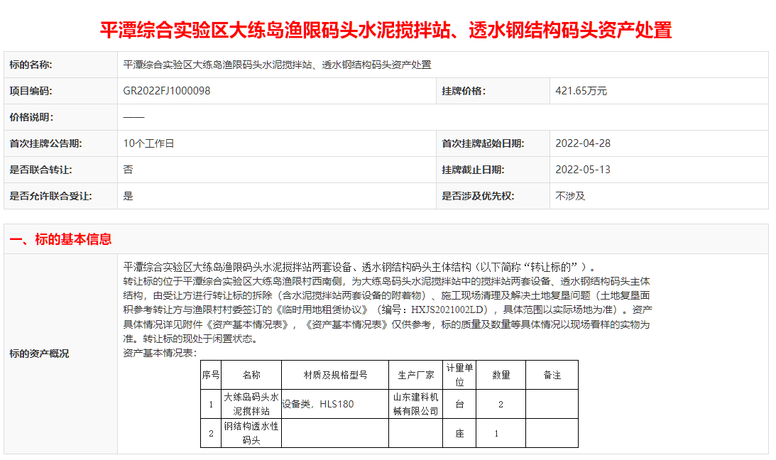 日前,福建省產(chǎn)權(quán)交易中心發(fā)布《平潭綜合實(shí)驗(yàn)區(qū)大練島漁限碼頭水泥攪拌站、透水鋼結(jié)構(gòu)碼頭資產(chǎn)處置》項(xiàng)目,掛牌價(jià)格為421.65萬元。