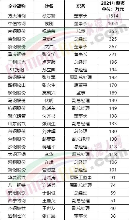 從2021年薪酬中可見,77位高管中華新水泥李葉青總裁年薪604萬元為年薪相對較高的一位。但是相比鋼鐵行業(yè)的薪酬卻顯得有些捉襟見肘。上市鋼企2021年薪酬最高的高管明細可見,方大特徐志新董事長年薪1614萬元,高出李葉青總裁1009.97萬元。