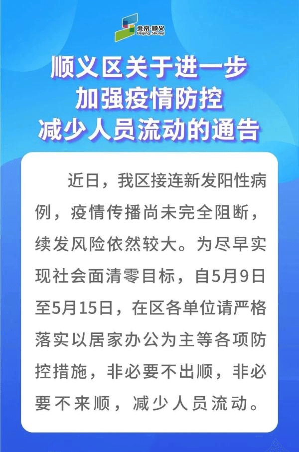 自5月9日至5月15日,順義區(qū)各單位嚴格落實以居家辦公為主的各項防控措施,非必要不出順,非必要不來順,減少人員流動。通告要求,居住在朝陽區(qū)和房山區(qū)、工作在順義區(qū),或居住在順義區(qū)、工作在朝陽區(qū)、房山區(qū)的人員,一律居家辦公;各單位確需到崗的,將上崗率嚴格控制在50%以內(nèi),實行單位-家庭“點對點”閉環(huán)出行方式為主,最大限度減少流動。