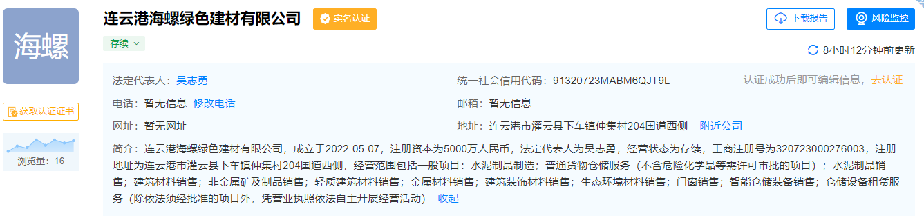 天眼查數(shù)據(jù)顯示,海螺綠色建材成立于2022年5月7日,法定代表人為吳志勇,注冊資本為5000萬元人民幣。該公司經(jīng)營范圍包括水泥制品制造、普通貨物倉儲服務(不含危險化學品等需許可審批的項目)等。海螺水泥持該公司股份100%。