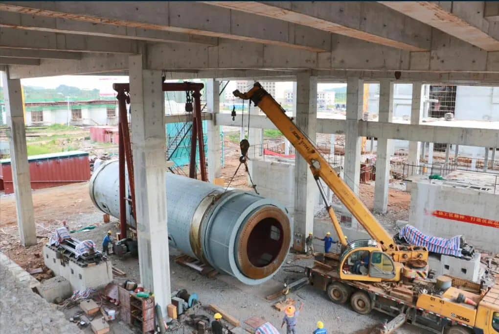項目從開工之初就面臨著工期緊、任務(wù)重的難題。其中,水泥粉磨機吊裝施工是項目的一個重要施工環(huán)節(jié),水泥磨筒體質(zhì)重120噸,由于水泥磨車間空間狹小,大型起重機械無法進(jìn)出吊裝,筒體需在車間外卸車,再將筒體移位至車間內(nèi)進(jìn)行安裝,為攻克這個重點難題,項目青年突擊隊員第一時間組織開會,討論解決方案,通過借鑒以往項目的施工經(jīng)驗,根據(jù)項目實際情況編制了吊裝施工方案,方案采用滑輪組、卷揚機、龍門架等設(shè)備,組合成一套吊裝系統(tǒng)再采用汽車吊配合吊裝,在吊裝過程中出現(xiàn)了不少問題,隊員們勇于挑戰(zhàn),迎難而上,經(jīng)過多次試驗和十幾天的日夜奮戰(zhàn),最終將兩臺水泥磨機成功精準(zhǔn)就位。