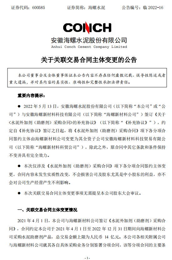日前,海螺水泥發(fā)布《關(guān)于關(guān)聯(lián)交易合同主體變更的公告》稱,2022年5月13日,安徽海螺水泥股份有限公司與安徽海螺新材料科技有限公司簽訂《關(guān)于<水泥外加劑(助磨劑)采購(gòu)合同>的補(bǔ)充協(xié)議》,約定自《補(bǔ)充協(xié)議》簽訂之日起,將《水泥外加劑(助磨劑)采購(gòu)合同》項(xiàng)下各分項(xiàng)合同簽約主體由海螺新材料公司變更為其全資子公司安徽海螺新材料科技貿(mào)易有限公司,除此之外,原合同中其它條款和條件保持不變并具有完全效力。