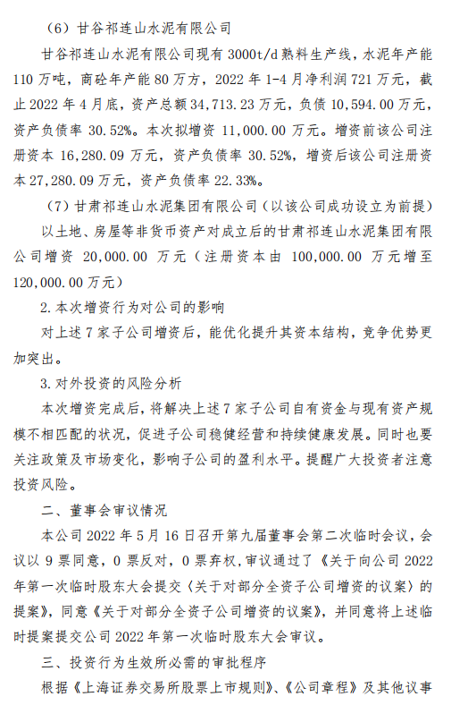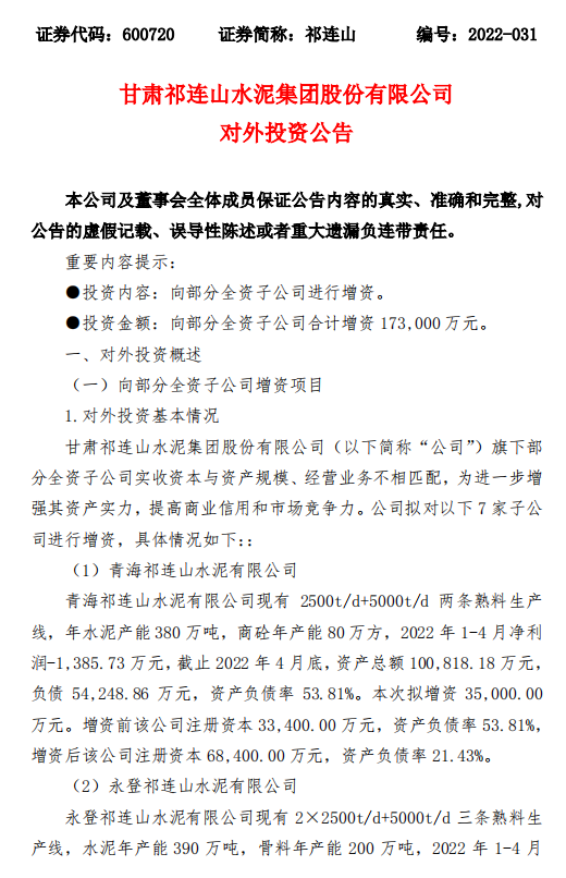 公司擬對7家子公司進(jìn)行增資,分別為青海祁連山水泥有限公司、永登祁連山水泥有限公司、成縣祁連山水泥有限公司、古浪祁連山水泥有限公司、漳縣祁連山水泥有限公司、甘谷祁連山水泥有限公司、甘肅祁連山水泥集團(tuán)有限公司(以該公司成功設(shè)立為前提)。向上述全資子公司合計(jì)增資17.3億元。公告原文如下: