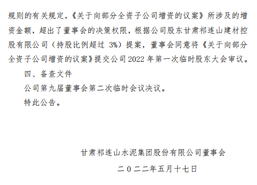 5月16日祁連山(600720.SH)公布,公司旗下部分全資子公司實(shí)收資本與資產(chǎn)規(guī)模、經(jīng)營業(yè)務(wù)不相匹配,為進(jìn)一步增強(qiáng)其資產(chǎn)實(shí)力,提高商業(yè)信用和市場競爭力。