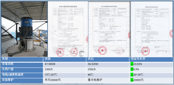 該風(fēng)掃煤球磨機(jī)設(shè)備改前電機(jī)功率為900KW,運(yùn)行功率均值為660KW,轉(zhuǎn)速為118轉(zhuǎn)/分,改后直驅(qū)電機(jī)額定功率不變,轉(zhuǎn)速為120轉(zhuǎn)/分,運(yùn)行功率均值為560KW,每小時(shí)節(jié)電100KWh,有功節(jié)電率為15.15%。