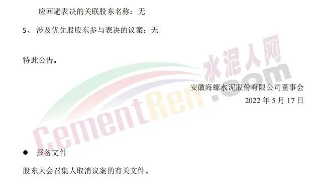同日發(fā)布《關(guān)于2021年年度股東大會取消議案的公告》稱,安徽海螺水泥股份有限公司董事會于2022年5月17日收到王誠先生的書面辭職報告,王誠先生因其個人工作變動,申請辭去公司董事長及執(zhí)行董事職務(wù)。根據(jù)《公司法》相關(guān)規(guī)定,其辭任已于當日生效。因此,原第10.01項議案“審議和表決關(guān)于選舉王誠先生擔任本公司第九屆董事會執(zhí)行董事的議案。”已不再適合提呈2021年度股東大會審議。