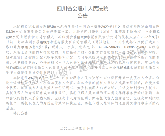 5月7日四川省會(huì)理市人民法院公告,根據(jù)涼山州會(huì)理船城牌水泥有限責(zé)任公司的申請(qǐng)于2022年4月21日裁定受理涼山州會(huì)理船城牌水泥有限責(zé)任公司破產(chǎn)清算一案,并指定四川毫達(dá)(涼山)律師事務(wù)所為涼山州會(huì)理船城牌水泥有限責(zé)任公司管理人。