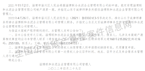 淄博聯(lián)和水泥企業(yè)管理有限公司管理人發(fā)布公告稱,2021年11月2日,淄博市淄川區(qū)人民法根據(jù)淄博聯(lián)合水泥企業(yè)管理有限公司的申請(qǐng),裁定受理淄博聯(lián)和水泥企業(yè)管理有限公司破產(chǎn)清算一案,并指定山東子誠(chéng)律師事務(wù)所擔(dān)任淄博聯(lián)和水泥企業(yè)管理有限公司管理人。2022年4月26日,淄博市淄川區(qū)人民法院作出決定,準(zhǔn)許山東子誠(chéng)律師事務(wù)所辭去淄博聯(lián)和水泥企業(yè)管理有限公司管理人職務(wù),并指定山東正大至誠(chéng)律師事務(wù)所擔(dān)任淄博聯(lián)和水泥企業(yè)管理有限公司管理人。