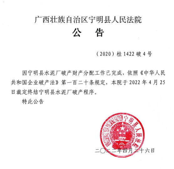 4月26日廣西壯族自治區(qū)寧明縣人民法院發(fā)布公告稱,因?qū)幟骺h水泥廠破產(chǎn)財(cái)產(chǎn)分配工作已完成,依照《中華人民共和國(guó)企業(yè)破產(chǎn)法》第一百二十條規(guī)定,法院于2022年4月25日裁定終結(jié)寧明縣水泥廠破產(chǎn)程序。
