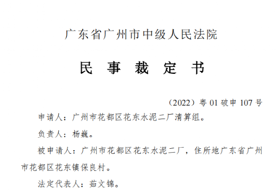 4月8日廣東省廣州市中級(jí)人民法院發(fā)布民事裁定書提到,受理廣州市花都區(qū)花東水泥二廠清算組對(duì)廣州市花都區(qū)花東水泥二廠的破產(chǎn)清算申請(qǐng)。