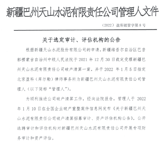 1月23日新疆巴州天山水泥管理人發(fā)布《關(guān)于選定審計(jì)、評(píng)估機(jī)構(gòu)的公告》稱,為順利推進(jìn)公司破產(chǎn)清算工作,經(jīng)向法院報(bào)告管理人于1月10日在全國(guó)破產(chǎn)重整案件信息網(wǎng)發(fā)布選聘審計(jì)和評(píng)估機(jī)構(gòu)對(duì)新疆巴州天山水泥有限責(zé)任公司開展專項(xiàng)財(cái)務(wù)審計(jì)和資產(chǎn)評(píng)估。