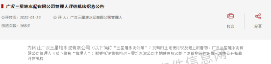 1月22日,廣漢三星堆水泥有限公司管理人發(fā)布《評(píng)估機(jī)構(gòu)招募公告》稱,為轉(zhuǎn)讓廣漢三星堆水泥有限公司擁有的土地使用權(quán)及地上附著物,廣漢三星堆水泥有限公司管理人擬委托評(píng)估機(jī)構(gòu)對(duì)三星堆水泥公司土地使用權(quán)及地上附著物進(jìn)行評(píng)估。