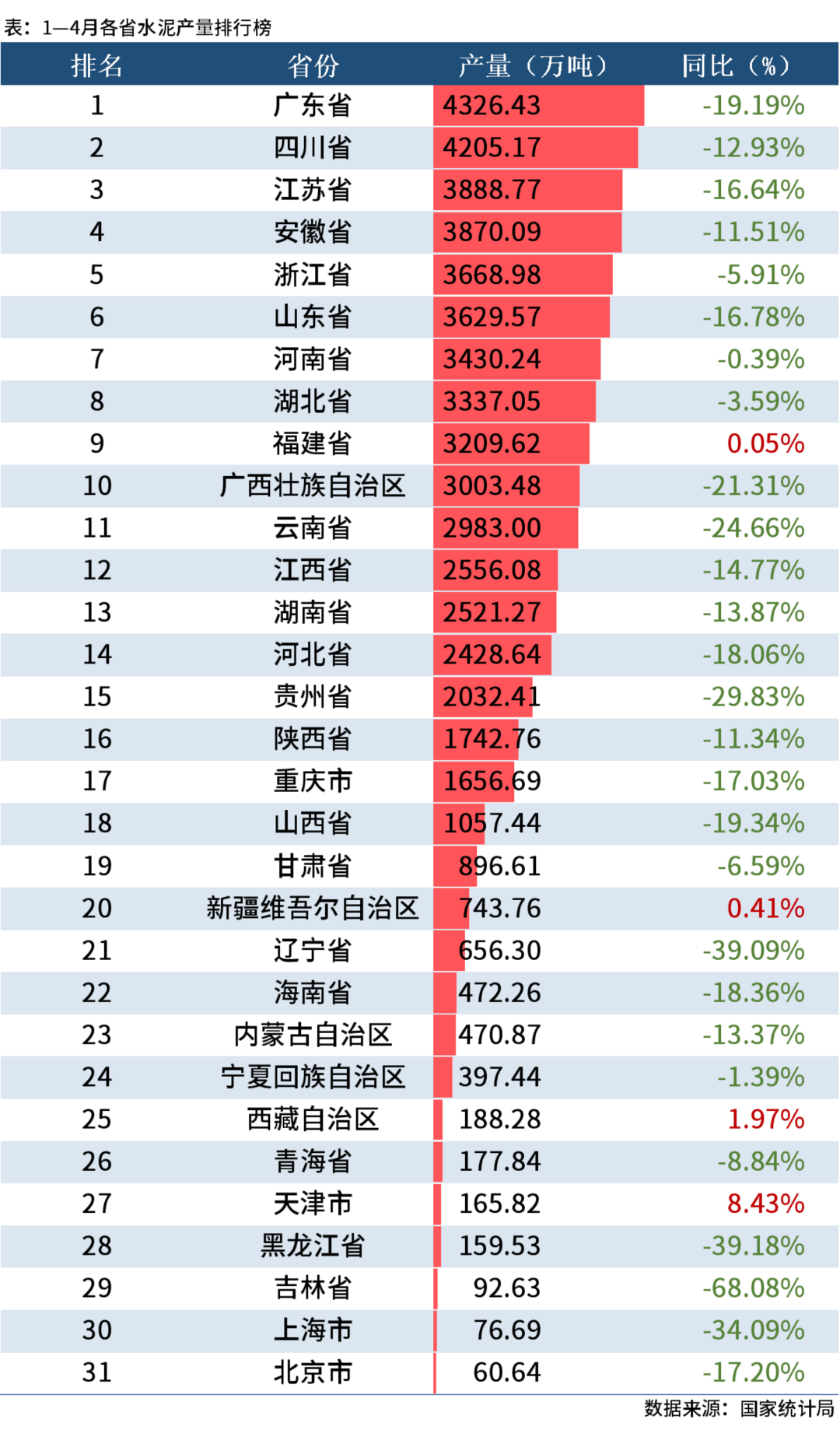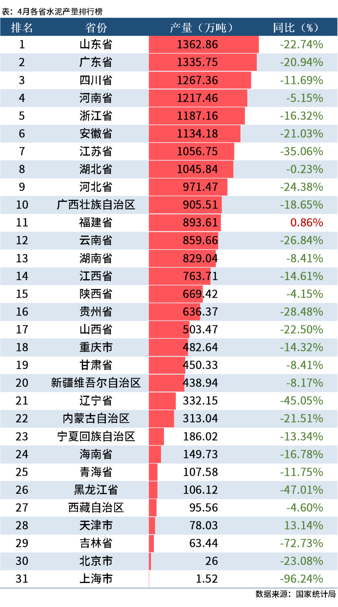 從分省數(shù)據(jù)來看,30省數(shù)市產(chǎn)量均有不同程度的下降,僅有福建省小幅增長(zhǎng)0.86%。其中,4月全國(guó)14個(gè)省市水泥產(chǎn)量同比降幅超20%,上海降96.24%、吉林降72.73%,黑龍江降47.01%、遼寧降45.05%、江蘇降35.06%、貴州降28.48%,云南降26.84%、河北降24.38%、北京降23.08%、內(nèi)蒙古降21.51%、山東降22.74%、安徽降低21.03%和廣東降20.94%。具體情況如下:
