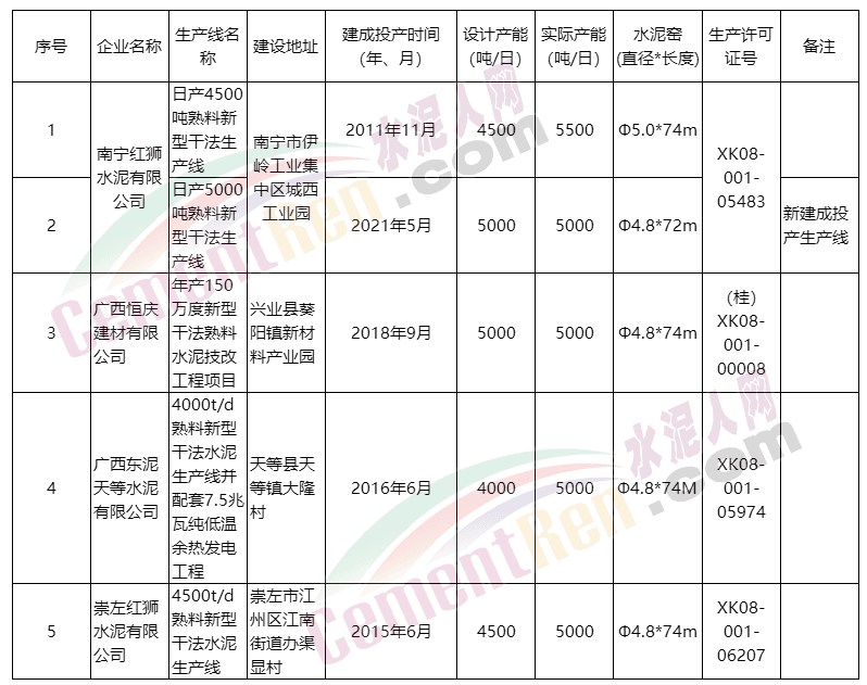 廣西工信廳數(shù)據(jù)顯示,新建并于2021年投產(chǎn)生產(chǎn)線共3條,分別為:南寧紅獅水泥日產(chǎn)5000噸熟料新型干法生產(chǎn)線,2021年5月建成投產(chǎn);宜州廣馳水泥有限責(zé)任公司2500t/d新型干法水泥熟料生產(chǎn)線,2021年7月建成投產(chǎn);北流市路寶水泥有限公司4500t/d新型干法水泥熟料生產(chǎn)線(二線),2021年10月建成投產(chǎn)。