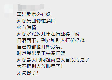 王誠辭職時(shí),就曾有網(wǎng)友表示,“作為世界500強(qiáng),一般不會(huì)如此輕率換帥(接任不足一年),其中必有故事。”也有網(wǎng)友表示:“事出反常必有妖,海螺集團(tuán)匆忙換帥必有隱情。”另有網(wǎng)友表示,“第一反應(yīng),腐敗了”。