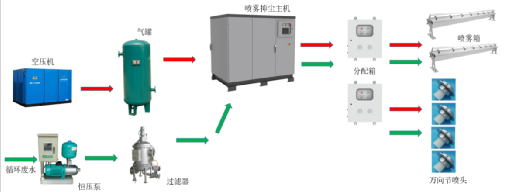 該系統(tǒng)通過空壓機制造壓縮空氣,輸送至儲氣罐,儲氣罐可保持壓縮空氣壓力恒定,將恒定的壓縮空氣輸送至噴霧抑塵主機,水泥廠水管網(wǎng)會有大量循環(huán)廢水,不能隨意排放,噴霧抑塵技術(shù)可以將其利用,將循環(huán)廢水輸送至恒壓泵,加壓后經(jīng)過過濾雜質(zhì),輸送給噴霧抑塵主機,經(jīng)噴霧抑塵主機調(diào)配壓力處理后,將壓縮空氣和水輸送給分配器,分配器再將壓縮空氣和水分別輸送給噴霧箱和萬向節(jié)噴頭。特制的雙流體噴頭,利用超聲波產(chǎn)生的微細水霧(10微米左右)捕集凝聚微細粉塵,將粉塵直接抑制在起塵點,避免了揚塵的出現(xiàn),使粉塵得到有效控制。既能保證揚塵的治理效果,也不會顯著增加產(chǎn)塵物料的濕含量,還能處理掉水泥廠的循環(huán)廢水。
