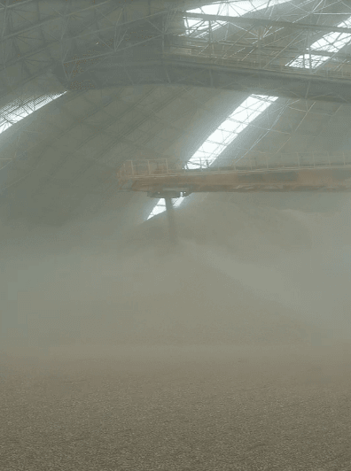 (1)通過噴灑水霧,原材料附近的濕氣將導(dǎo)致水分聚集在粉塵顆粒周圍,從而增加了粉塵顆粒的質(zhì)量和直徑,這有利于粉塵之間的碰撞。當(dāng)粉塵顆粒相互碰撞時,由于表面上的水分,回彈力降低,粉塵顆粒逐漸沉降。