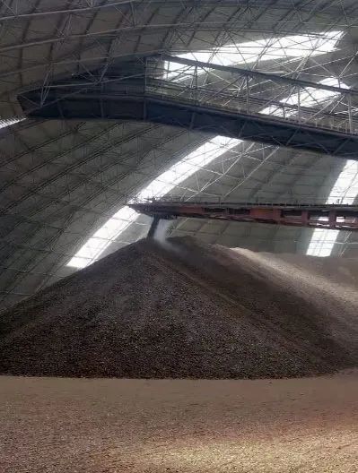 圓形預(yù)均化堆場是原料在粉磨之前,預(yù)先將原料成分進行均化的堆場,通過水平分層堆放和垂直切割的方法,可以使原料成分得到均化。原料用架空膠帶輸送機進行堆料,取料設(shè)備有橋式切割耙取料機。