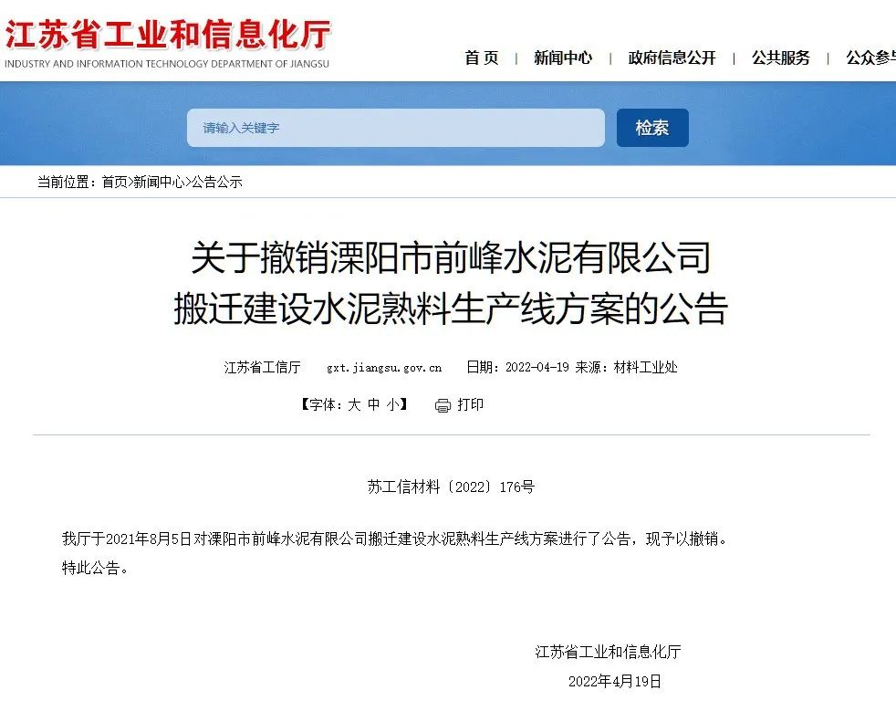 今年4月19日,江蘇省工信廳發(fā)布公告稱(chēng),撤銷(xiāo)2021年8月5日發(fā)布的《溧陽(yáng)市前峰水泥有限公司搬遷建設(shè)水泥熟料生產(chǎn)線(xiàn)方案公告》。