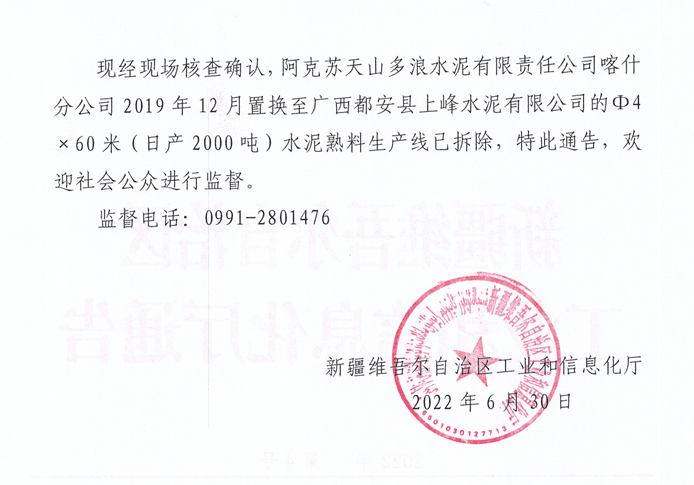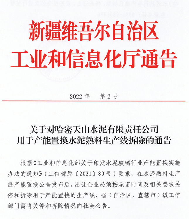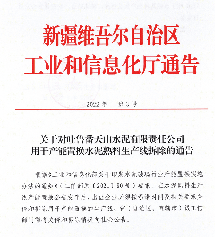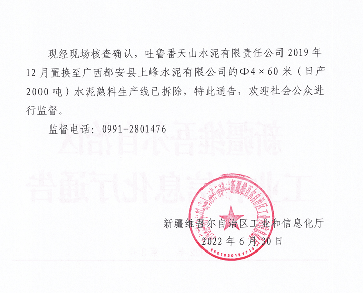 6月30日,新疆維吾爾自治區(qū)工業(yè)和信息化廳發(fā)布3則水泥生產(chǎn)線(xiàn)拆除的通告提到,哈密天山水泥2500t/d、吐魯番天山2000t/d、阿克蘇天山多浪水泥2000t/d熟料生產(chǎn)線(xiàn)已拆除。三條生產(chǎn)線(xiàn)產(chǎn)指指標(biāo)均置換至廣西都安縣上峰水泥有限公司的水泥熟料生產(chǎn)線(xiàn)項(xiàng)目。