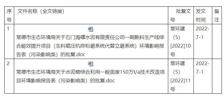 7月4日,湖南省常德市石門(mén)縣政府轉(zhuǎn)發(fā)環(huán)局石門(mén)分局的《石門(mén)海螺水泥有限責(zé)任公司一期熟料生產(chǎn)線(xiàn)綜合能效提升項(xiàng)目(生料輥壓機(jī)終粉磨系統(tǒng)代替立磨系統(tǒng))等2個(gè)環(huán)境影響報(bào)告表(污染影響類(lèi))審批決定的公告》稱(chēng),經(jīng)審查,生環(huán)局石門(mén)分局對(duì)石門(mén)海螺水泥有限責(zé)任公司一期熟料生產(chǎn)線(xiàn)綜合能效提升項(xiàng)目(生料輥壓機(jī)終粉磨系統(tǒng)代替立磨系統(tǒng))等2個(gè)環(huán)境影響報(bào)告表(污染影響類(lèi))作出審批決定。并將作出的審批決定予以公告。公告期為2022年7月1日-2022年7月7日。