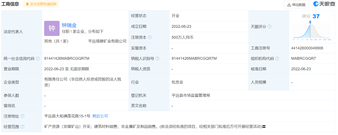 天眼查APP顯示,平遠(yuǎn)塔牌礦業(yè)有限公司,于2022年6月23日成立,注冊(cè)資本為500萬人民幣,法定代表人為鐘瑞金,經(jīng)營(yíng)狀態(tài)為開業(yè),工商注冊(cè)號(hào)為441426000049906,注冊(cè)地址為平遠(yuǎn)縣大柘鎮(zhèn)蓮花路15-1號(hào),經(jīng)營(yíng)范圍包括礦產(chǎn)資源(非煤礦山)開采;建筑材料銷售;非金屬礦及制品銷售。