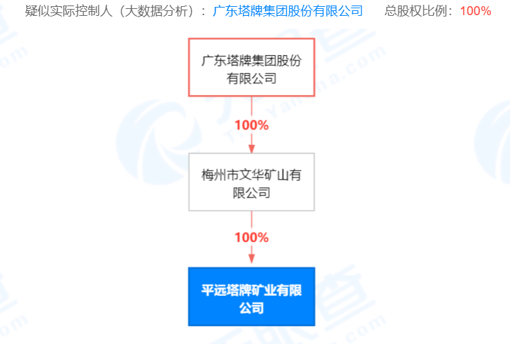 企業(yè)疑似實(shí)際控制人為廣東塔牌集團(tuán)股份有限公司,總股權(quán)比例達(dá)100%。