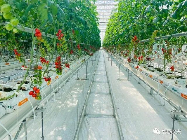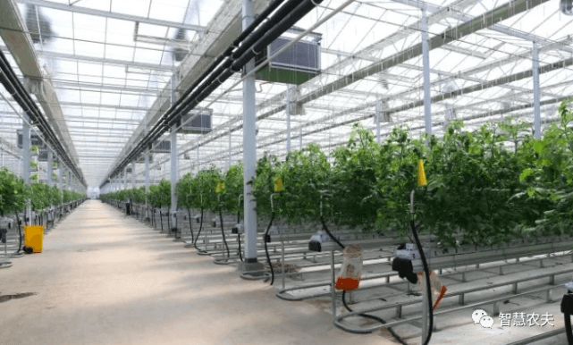 在溫室內(nèi)碧綠的番茄長得郁郁蔥蔥,長長的懸掛式鋼絲蔓繩,有利于作物攀爬生長,增加產(chǎn)量。成排的管道通往室內(nèi)各個方向,筆直的采摘軌道,既用來運載采摘車,也用來傳遞余熱轉化成的熱水或者冷水。番茄生長每一個環(huán)節(jié)都依托大數(shù)據(jù)云計算自動采集、監(jiān)測、分析農(nóng)作物生長環(huán)境信息,并利用物聯(lián)網(wǎng)技術,精準調(diào)控棚內(nèi)的溫度、濕度、施肥量、澆水量等,科學調(diào)節(jié)農(nóng)作物生命規(guī)律,延長生長周期,實現(xiàn)智慧化管理、標準化生產(chǎn)。