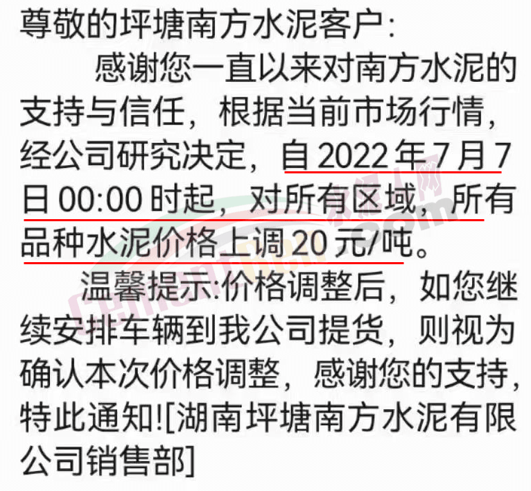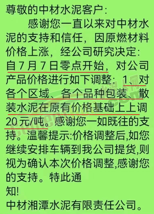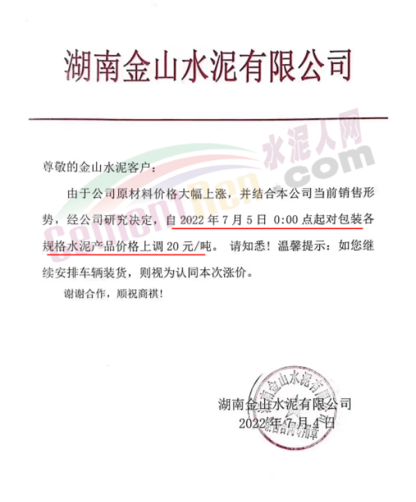 湖南金山水泥通知,由于公司原材料價格大幅上漲,結(jié)合公司當前銷售形勢,經(jīng)公司研究決定,自7月5日0時起對包裝各規(guī)格水泥產(chǎn)品價格上調(diào)20元/噸。