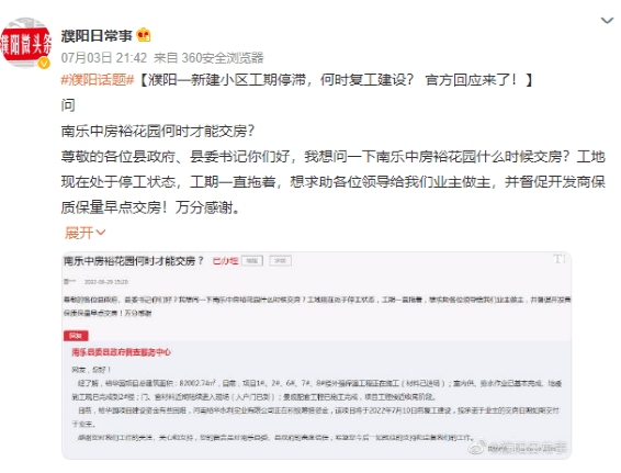 濮陽(yáng)一新建小區(qū)工期停滯,何時(shí)復(fù)工建設(shè)?官方回應(yīng)項(xiàng)目方建設(shè)資金有困難,企業(yè)正在積極籌措資金,項(xiàng)目將于7月10前復(fù)工建設(shè)。