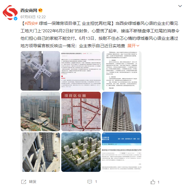 近期眾多網(wǎng)友在社交媒體上曬出項(xiàng)目停工的消息。據(jù)不完全統(tǒng)計(jì),6月下旬至今社交媒體上曬出的項(xiàng)目停工的消息涉及遠(yuǎn)洋山水、正榮地產(chǎn)、世茂集團(tuán)、融信中國(guó)、綠城地產(chǎn)、恒大、佳兆業(yè)、融創(chuàng)中國(guó)、陽(yáng)光城等多個(gè)地產(chǎn)龍頭企業(yè)。