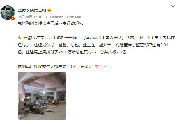 4月份融創(chuàng)暴雷后,惠州融創(chuàng)某樓盤工地處于半停工業(yè)主早上去找住建局了,住建局領(lǐng)導(dǎo),融創(chuàng),總包,業(yè)主在一起開(kāi)會(huì),現(xiàn)場(chǎng)查看了監(jiān)管賬戶還有2.31億,住建局上周撥付了2500萬(wàn)給總包買材料,總共大概2.6億。