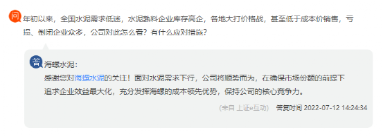 日前有投資者向海螺水泥提問,年初以來,全國水泥需求低迷,水泥熟料企業(yè)庫存高企,各地大打價格戰(zhàn),甚至低于成本價銷售,虧損、倒閉企業(yè)眾多,公司對此怎么看?有什么應(yīng)對措施?