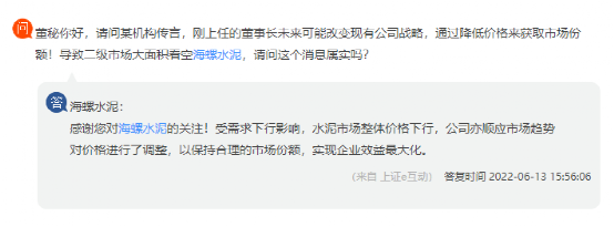 據(jù)了解,近期海螺水泥在回復(fù)投資者提問時曾多次提到“確保市場份額,追求企業(yè)效益最大化”。