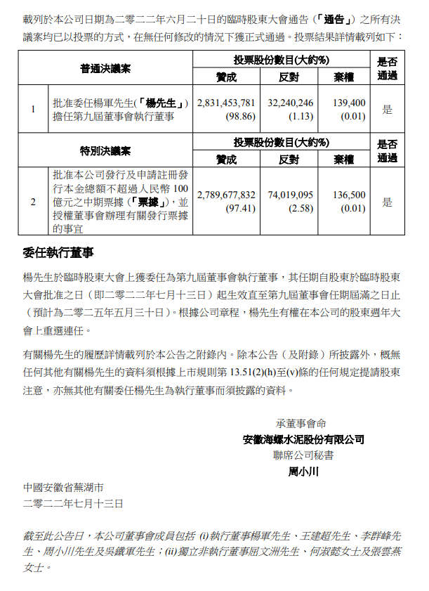 楊先生于二零二二年五月加入安徽海螺集團(tuán)有限責(zé)任公司(「海螺集團(tuán)」),現(xiàn)擔(dān)任海螺集團(tuán)黨委書記、董事長(zhǎng)。