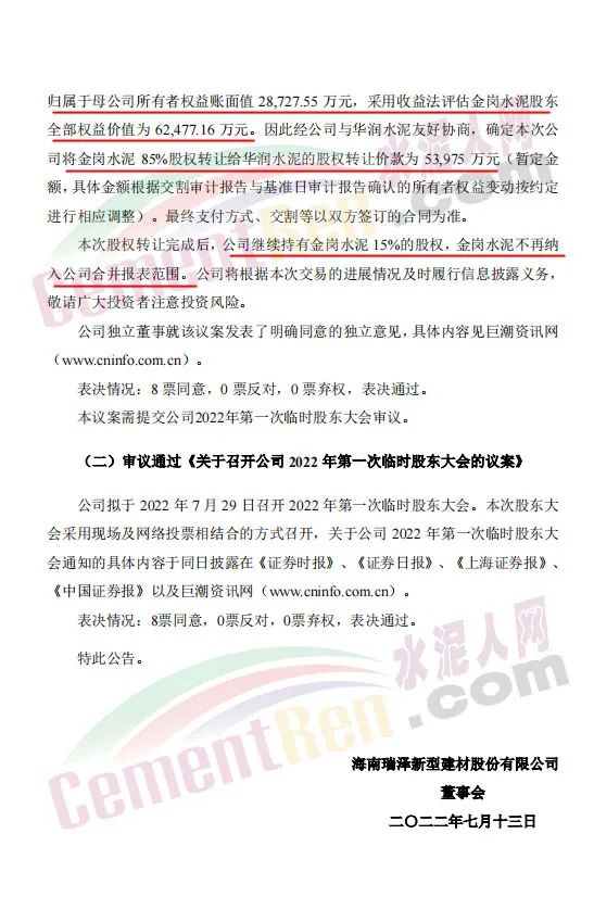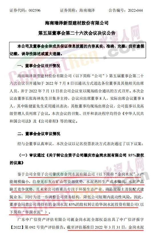 7月13日,海南瑞澤發(fā)布公告,鑒于公司全資子公司肇慶市金崗水泥有限公司(以下簡稱“金崗水泥”)產(chǎn)能規(guī)模偏小,自身無石灰石礦山等資源優(yōu)勢,水泥熟料生產(chǎn)成本偏高,水泥產(chǎn)品缺乏競爭優(yōu)勢,且未來公司將重點(diǎn)專注于環(huán)保生態(tài)產(chǎn)業(yè)、商品混凝土及裝配式建筑業(yè)務(wù);同時(shí)為進(jìn)一步調(diào)整公司債務(wù)結(jié)構(gòu),降低公司短期內(nèi)流動(dòng)性風(fēng)險(xiǎn)。因此,董事會(huì)同意公司將持有的金崗水泥85%的股權(quán)轉(zhuǎn)讓給華潤水泥投資有限公司。