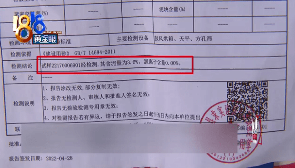 在建設(shè)用砂檢測報(bào)告中結(jié)論是“試樣經(jīng)檢測,其含泥量為3.6,氯離子含量0%”。雖未明確是否合格,檢測機(jī)構(gòu)工作人員表示,“她只讓做了這兩個(gè)數(shù)據(jù),這兩個(gè)數(shù)據(jù)是符合要求的。”